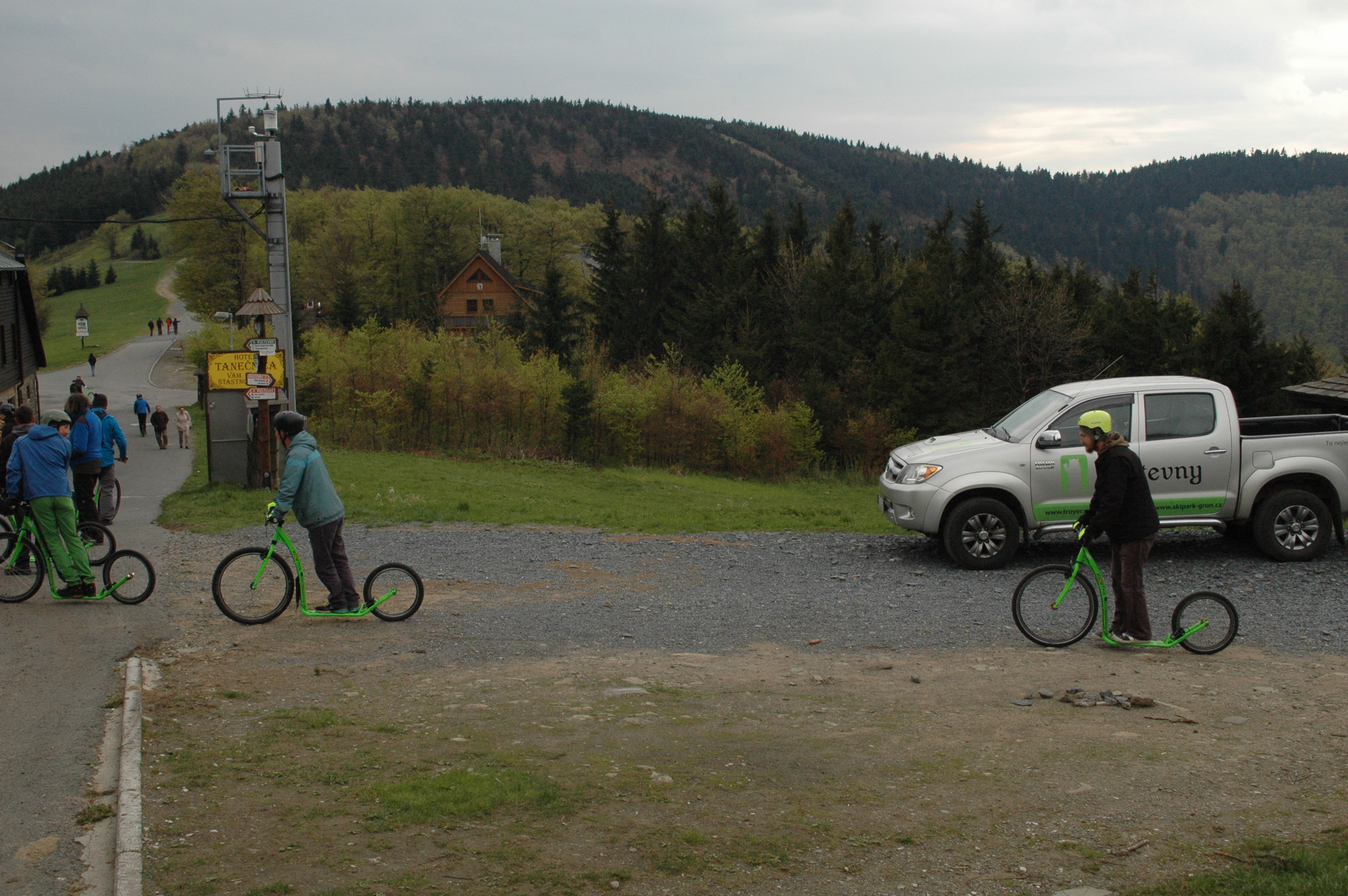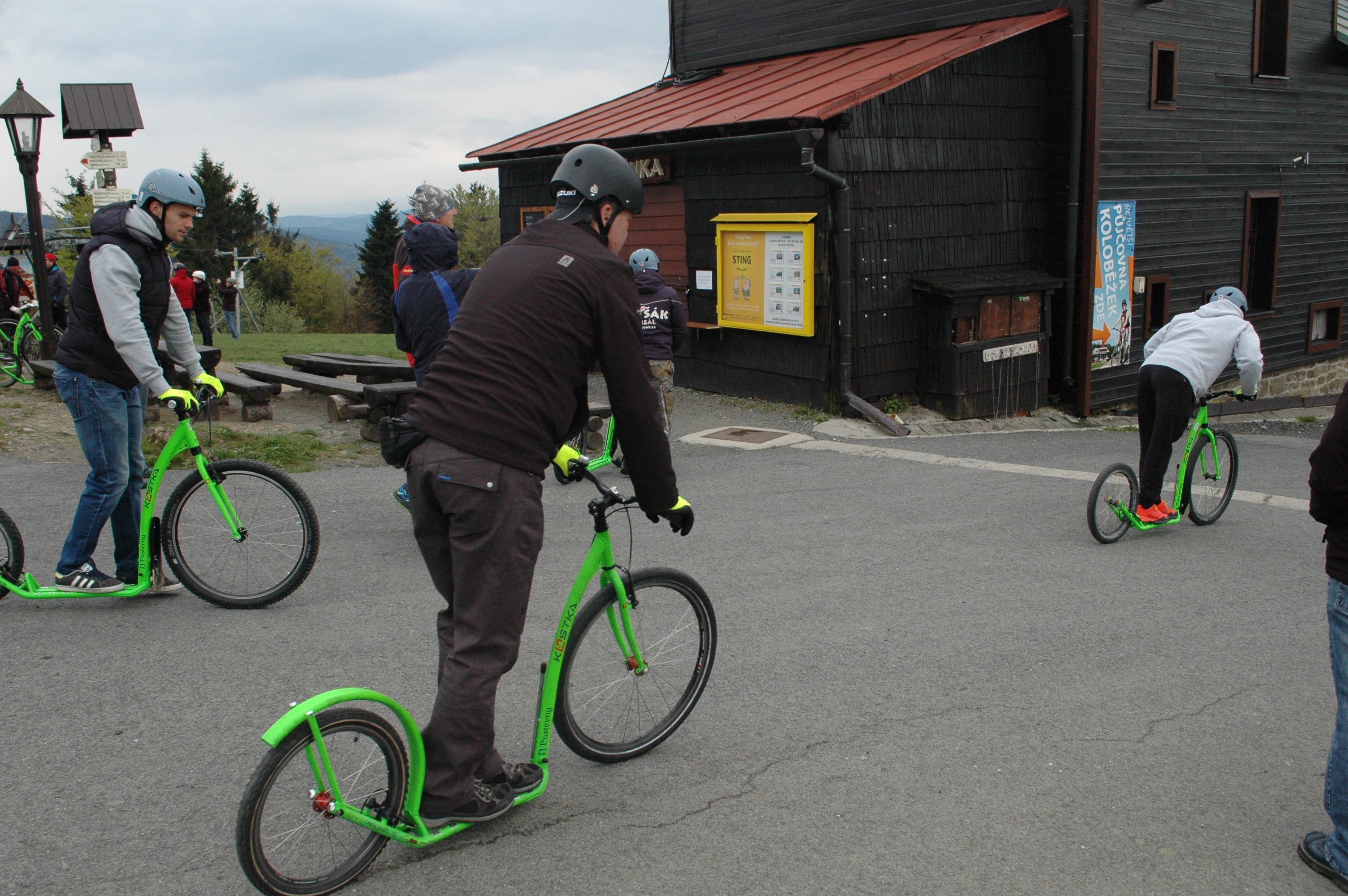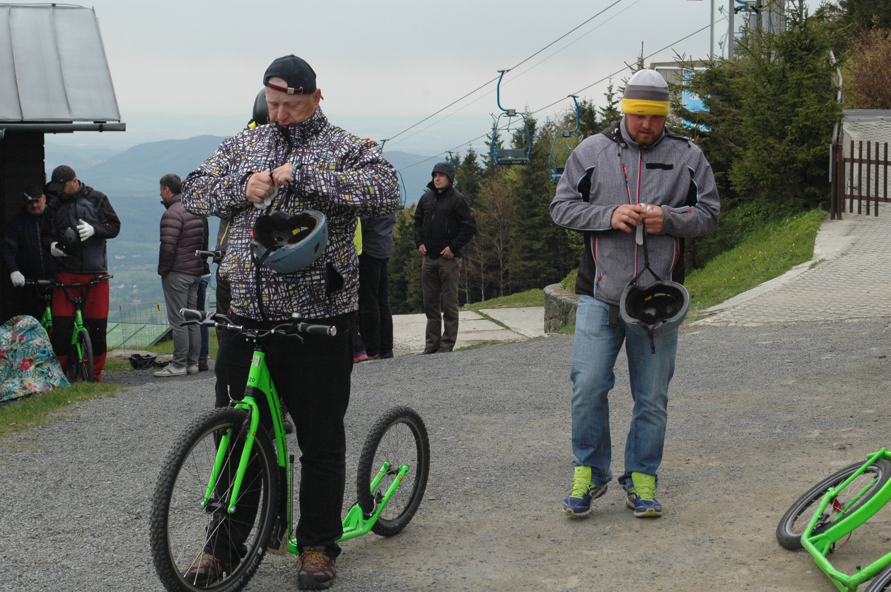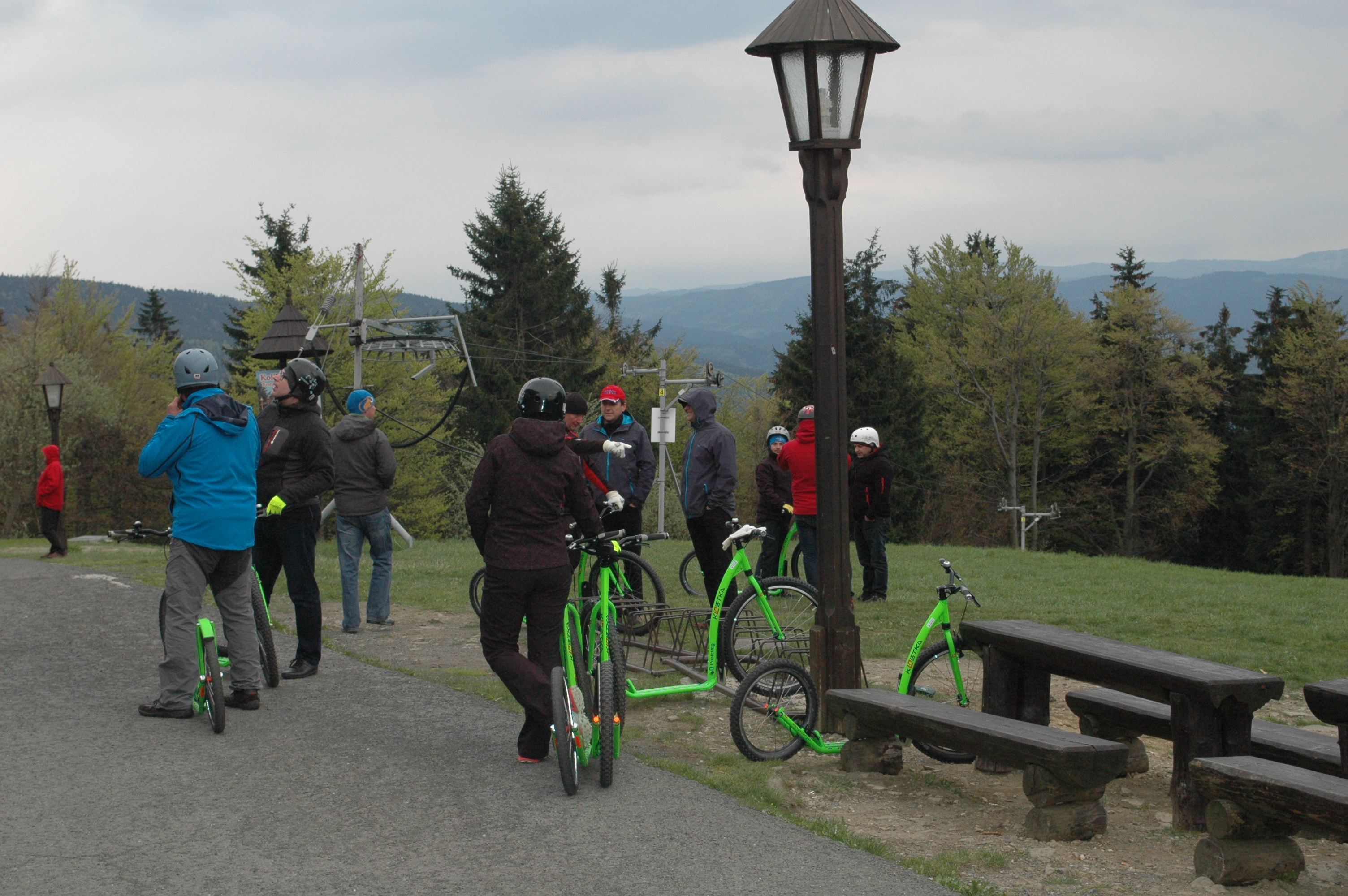 Jako součást exkurze na lanovou dráhu Pustevny v rámci školení vedoucích provozu lanových drah a jejich zástupců měli účastníci možnost užít si sjezd do Trojanovic na koloběžkách.