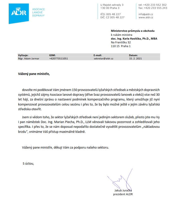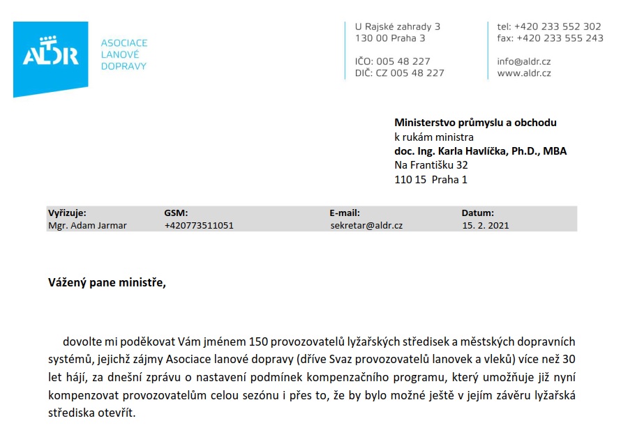 Dne 15.2. 2021 vydalo MPO tiskovou zprávu ke spuštění kompenzačního programu pro lyžařská střediska, na základě kterého je možno kompenzovat provozovatelům 50% nákladů již nyní za celou sezónu.