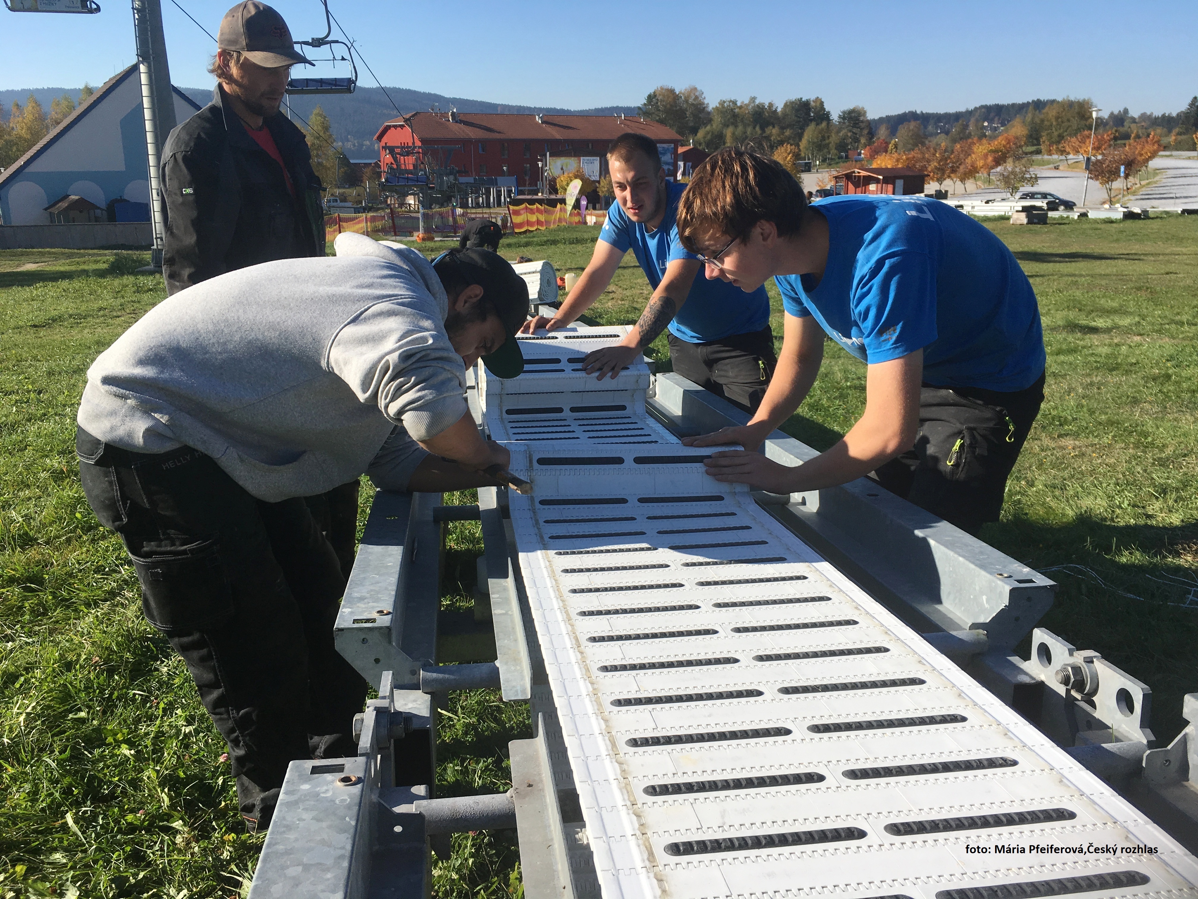 „Sotva jsme skončili letní sezónu, už se připravujeme na tu zimní, není na co čekat. Zrovna teď se montuje pojízdný koberec v dětském parku, který bude sloužit nejmenším lyžařům a lyžařské škole,“ ukazuje Vojen Smíšek ve Skiareálu Lipno.