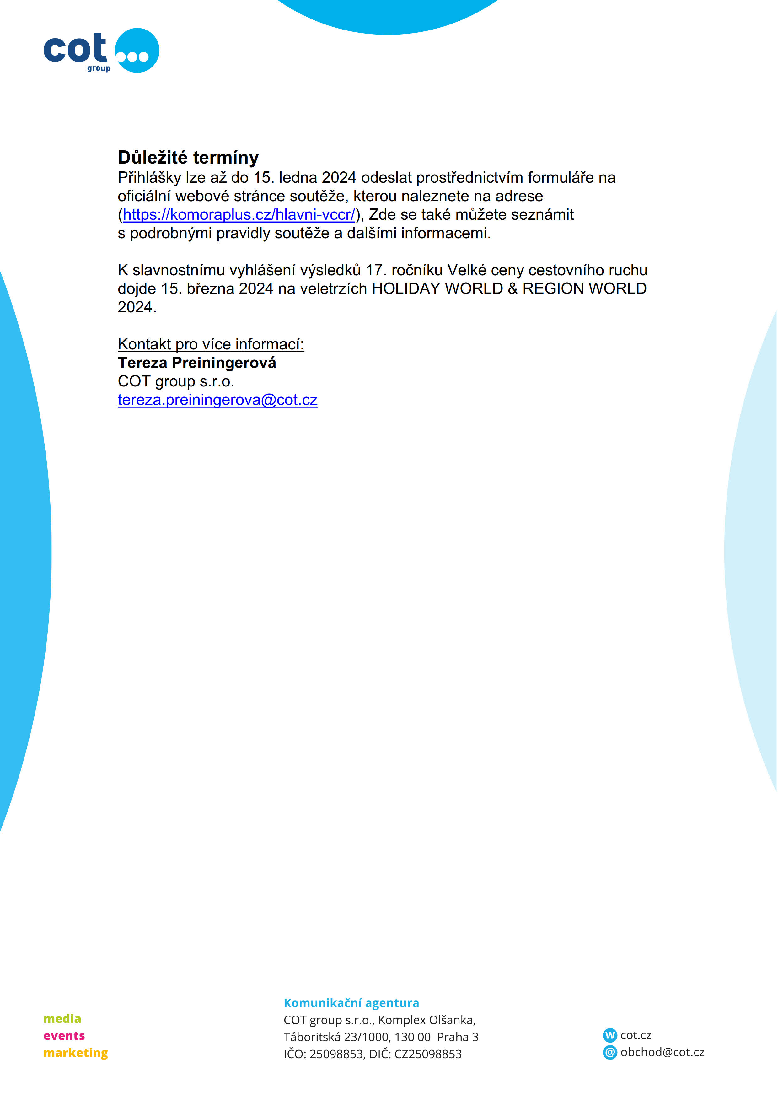 Společnost COT group jako hlavní organizátor Velké ceny cestovního ruchu začala přijímat přihlášky do 17. ročníku této prestižní soutěže.