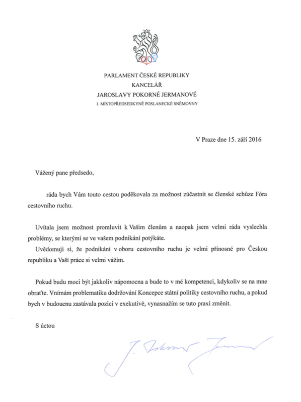 1. místopředsedkyně Poslanecké sněmovny ČR Jaroslava Pokorná Jermanová poděkovala Fóru cestovního ruchu České republiky za možnost zúčastnit se Členské schůze FCR, která se odehrála 7. září 2016.