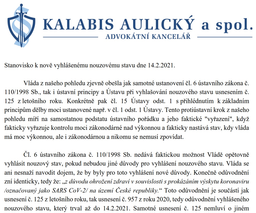 Stanovisko advokátní kanceláře Kalabis Aulický a spol. k nově vyhlášenému nouzovému stavu dne 14.2.2021.