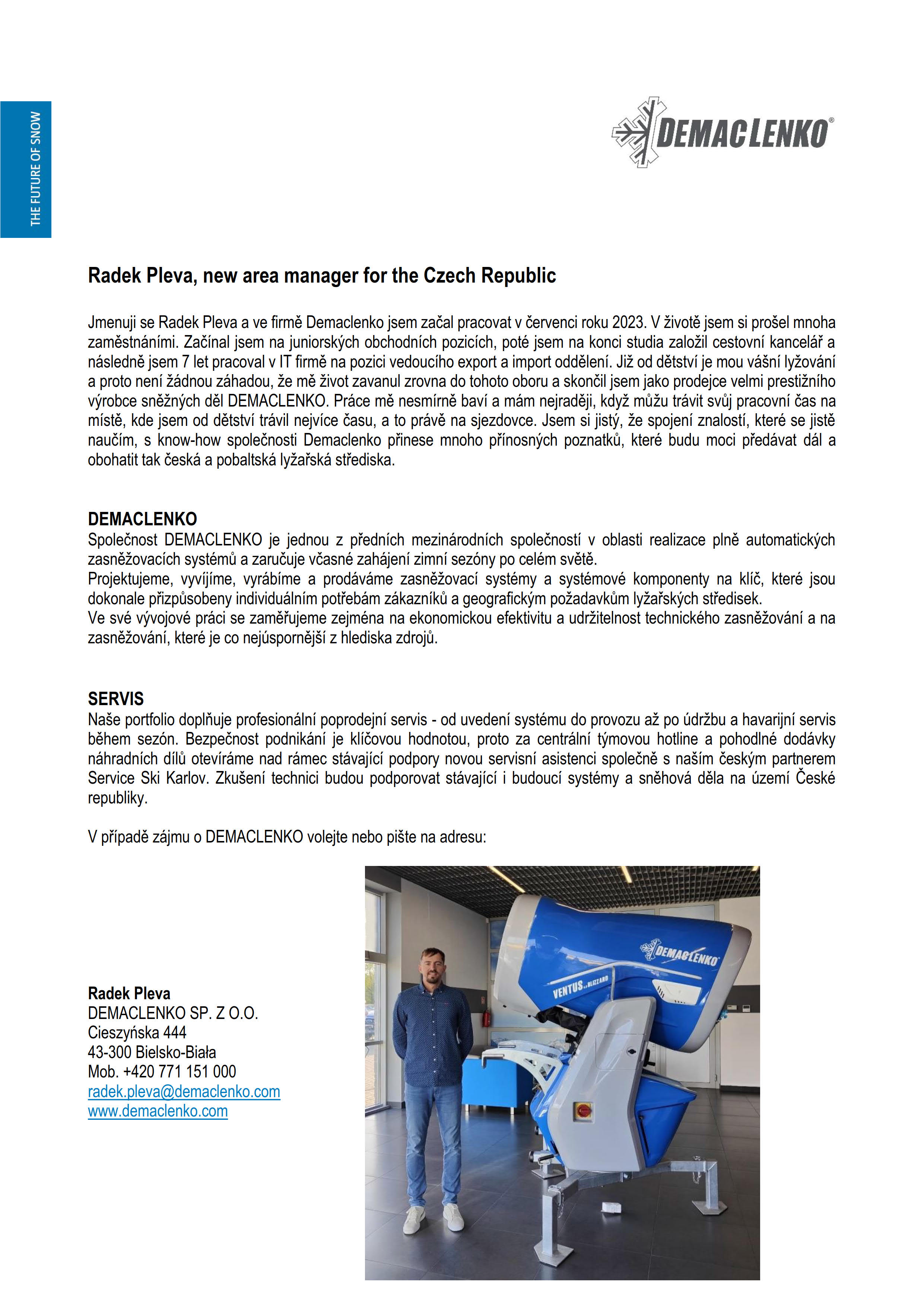 Představujeme provozovatelům lyžařských středisek pana Radka Plevu - nového zástupce společnosti Demaclenko pro český trh.