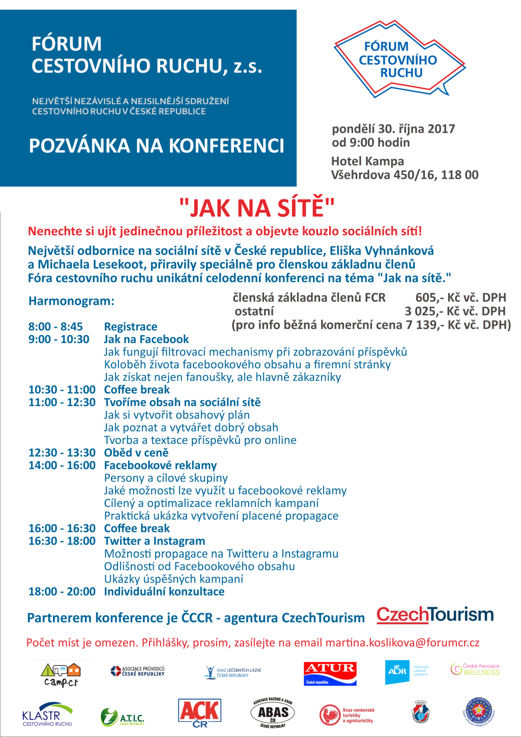 Největší odbornice na sociální sítě v České republice, Eliška Vyhnánková a Michaela Losekoot, připravily speciálně pro členskou základnu členů Fóra cestovního ruchu ČR unikátní celodenní konferenci na téma "Jak na sítě". Konference se uskuteční 30. 10. 2017 od 9:00 v Hotelu Kampa v Praze.