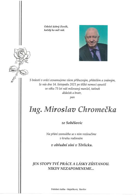 Dovolujeme si lanovkářské komunitě oznámit smutnou zprávu, že nás dne 14. listopadu 2021 opustil pan Ing. Miroslav Chromečka.