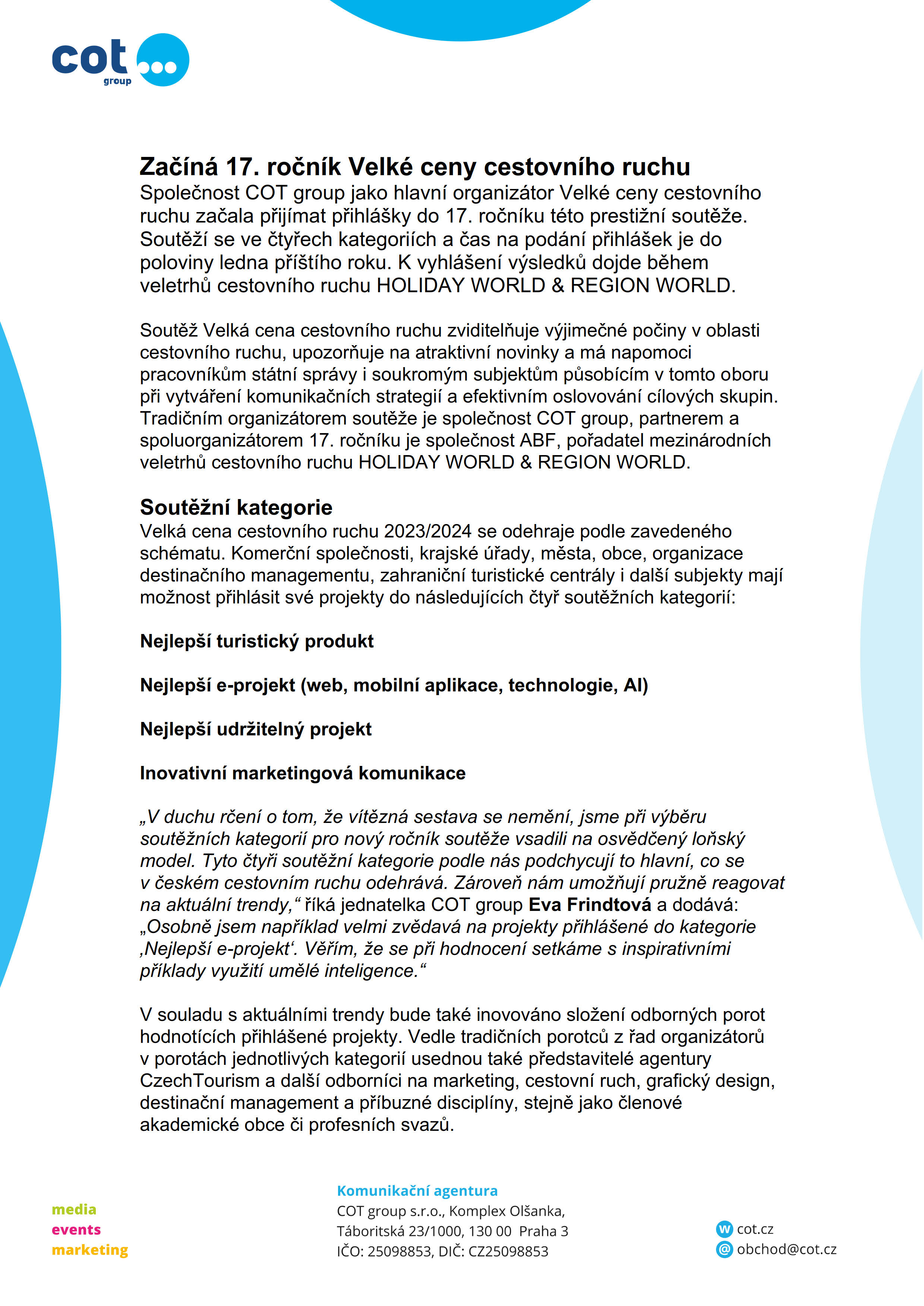 Společnost COT group jako hlavní organizátor Velké ceny cestovního ruchu začala přijímat přihlášky do 17. ročníku této prestižní soutěže.